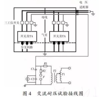 本次實驗對母線進行交流耐壓實驗,按圖4進行實驗接線,加壓端口在4×15避雷器電纜插口處。