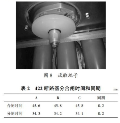 本次實驗選取422斷路器進行機械特性查驗,按圖6進行實驗接線。將4221阻隔開關置于接地方位,將實驗端子接到柜內電纜接口,然后將實驗線接到實驗端子下端進行實驗。實驗端子如圖8所示。422斷路器分合閘時間和同期見表2